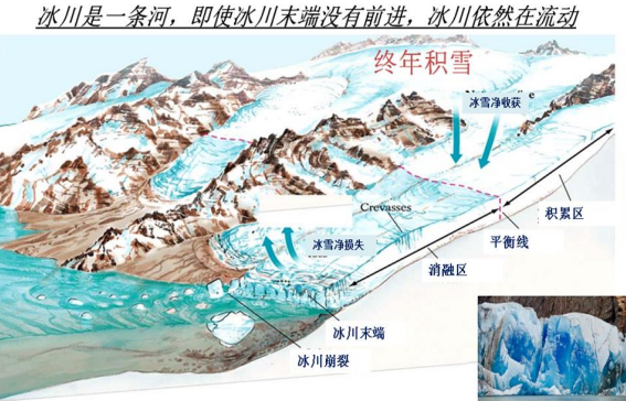 冰川出现的地方,经过一段时间,冬季降雪超过夏季融雪量,使雪在表面堆积并转化为冰。 一旦达到临界厚度(约 30 米)和密度(约 0.85 g/cm3),这种冰就会在重力的影响下变形和下坡移动,形成冰川。 冰川的健康状况可以通过其质量平衡来定义。 当每年的雪和冰的积累超过了融化和其他过程,如冰山的崩解的损失,冰川有一个正的物质平衡和增加的质量。 当雪和冰的损失超过质量的增加,冰川有一个负的质量平衡。 总的来说,冰川的上游部分(堆积区)是净增加的,冰川的下部(消融区)是净减少的。 分隔这两个区域的线是平衡线,平衡线高度(ELA)是给定年份净累积为零的海拔高度。 冰川流动将冰从堆积区转移到消融区。 如果冰川根部的损失超过了下游冰川的弥补,那么冰川根部的位置就会向上游退缩(冰川“退缩”);如果每年运送到冰川 冰舌的冰超过融化量,冰川前缘就会向前推进。 一般来说,具有负质量平衡的冰川表 现出萎缩,尽管它们也可能通过变薄而没有使得长度萎缩而失去相当大的质量。