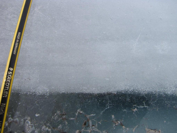 近距离观察富含气泡的白色冰。 请注意,在粗糙透明的冰和气泡丰富的冰之间 有一个锐利的交界处。