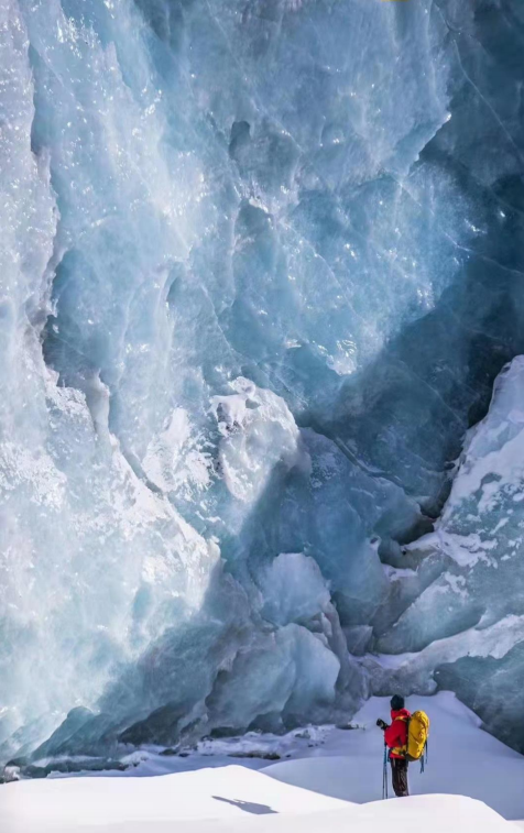 冰川冰是蓝色的,因为较长的可见波长被吸收了。 能量较强的蓝色波长则被散射回来。 这种影响对深层的、无气泡的、有大晶体的基冰影响最大。 因此,蓝色往往是最强烈的呼吁崩解的冰山或新断裂。 粗糙的、风化的冰和新雪会呈现白色,因为没有发生优先吸收。