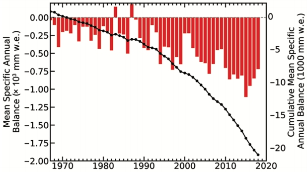 图显示自 1968 年以来每年 WGMS 37 参考冰川的质量平衡(红条),以及随着时间的推移总质量损失(黑线)。