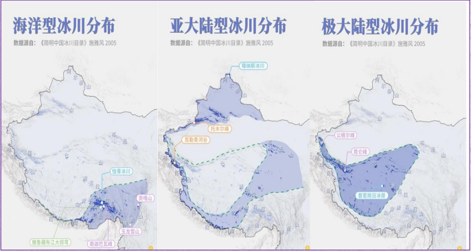 根据冰川发育的水热条件和物理性质, 青藏高原及周边地区冰川可分为海洋型冰川、亚大陆型冰川和极大