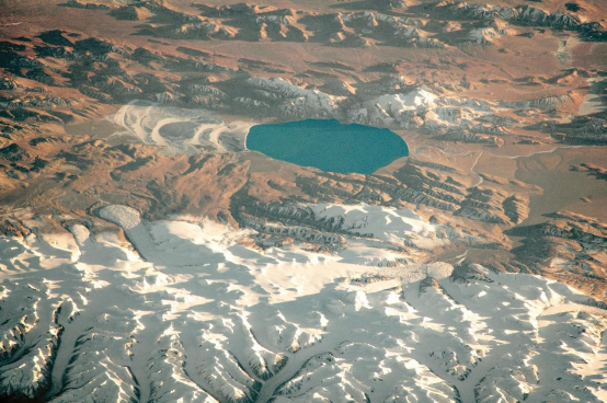 西昆仑山的冰川群,在这个照片中,最左侧就是崇测冰帽,远处是郭扎错(NASA 提 供)