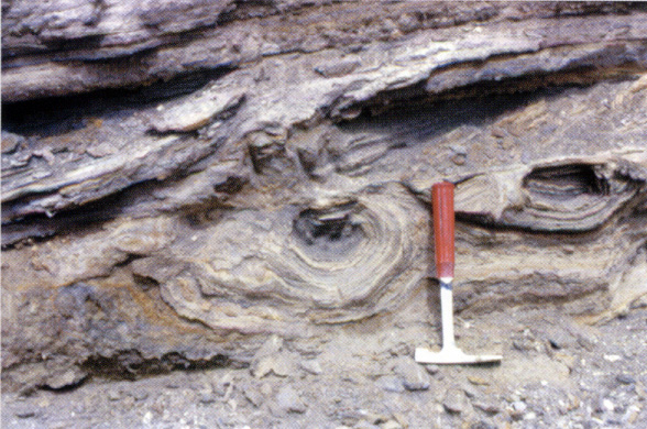 融冻扰动一般发生在多年冻土的活动层内。当活动层于每年冬季自地表向下冻结时,由于底部永冻层起阻挡作用,结果使其中间尚未冻结的融土层(含水土层),在上下方冻结层的挤压作用下,发生塑性变形,形成各种大小不一,形状各异的融冻褶皱,又称冰卷泥。