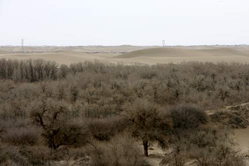 “点、线、片”三结合的实施布局。居延绿洲天然林草植被分布,除了柽柳林比较集中连片,其它物种的自然分布,大都是呈条、块状,且多与沙丘和戈壁台地相间,各自成生态单元。因此,要按“锁边、封线、绿点、建片”技术流程,首先锁住绿洲边缘流沙入侵,固定活动沙丘外延;围栏封育东、西河流域两条绿色生态防线;植树种草建设牧民定居点和村镇驻地绿点;运用综合工程建设三角洲生态片。把大小各异的生态单元联结起来,营造绿洲新的生态系统。