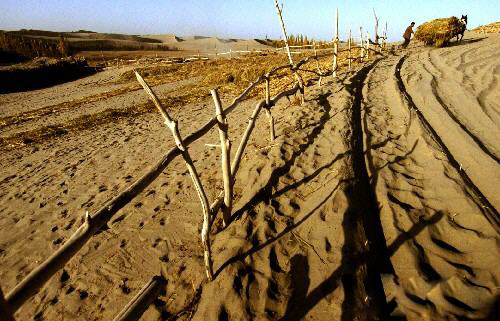 1960—1970年,“向沙漠进军”的误导和“以粮为纲”政策的指引下,为了生存开垦荒地;90年代在市场经济及其经济利益的驱动下,大面积开垦荒地种植籽瓜;近年来,随着粮食价格放开和人民生活水平的提高出现了开垦荒地的第三次高潮。另一个原因,随着民勤人口的增加(1980年24万,近年30余万),湖区大面积土地盐渍化,使人均耕地面积相对减少,开垦荒地以提高生活水平为需要。荒地面积增加,大量抽取地下水,地下水位迅速下降,植被衰败死亡,绿洲屏障功能衰退;另一方面,开垦荒地多为白刺固定沙丘的破坏,沙丘变耕地,植被遭破坏,弃耕后风起沙扬,沙漠化加剧,绿洲外围生态系统破坏,整个绿洲生态环境恶化。