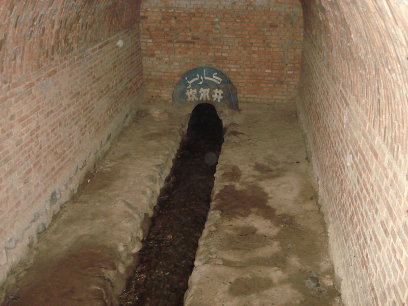 坎儿井的名称,新疆维吾尔语称为“坎儿孜”。吐鲁番有近千条坎儿井,累计全长约500O公里。坎儿井的结构,大体上是由竖井、地下渠道、地面渠道和“涝坝”(小型蓄水池)四部分组成。吐鲁番盆地北部的博格达山和西部的喀拉乌成山,春夏时节有大量积雪和雨水流下山谷,潜入戈壁滩下。人们利用山的坡度,巧妙地创造了坎儿井,引地下潜流灌溉农田。坎儿并不因炎热、狂风而使水分大量蒸发,因而流量稳定,保证了自流灌溉。坎儿井是开发利用地下水的一种很古老式的水平集水建筑物,适用于山麓、冲积扇缘地带,主要是用于截取地下潜水来进行农田灌溉和居民用水。根据1962年统计资料我国新疆共有坎儿井约1700多条,总流量约为26米3/秒,灌溉面积约50多万亩。其中大多数坎儿井分布在吐鲁番和哈密盆地,如吐鲁番盆地共有坎儿井约1100多条,总流量达18米3/秒,灌溉面积47万亩,占该盆地总耕地面积70万亩的67%,对发展当地农业生产和满足居民生活需要等都具有很重要的意义。