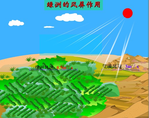 气流经过绿洲时,绿洲的植被特别是树木等高粗糙元能够有效消耗气流的动能或动量,这使得气流进入绿洲后风速立即减弱,起到了风速屏障的作用。在甘肃临泽的观测个例中,如果在1m高处荒漠吹来的风速大约为3m/s时,进入绿洲后风速就减弱为不到0.5m/s,减弱了近6倍。绿洲这种屏障功能不仅减弱了风蚀,减少了蒸发,有利于绿洲自我保护,同时还能非常有效地抗御沙尘暴,与前面的“冷岛”和“湿岛”结构一起给人类维持了一个相对凉爽、湿润、平静的生存环境。