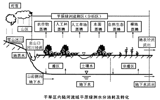 从总体上分析,干旱区内陆河流域平原绿洲水循环有如下特点:① 由于降水稀少,且大部分直接消耗于腾发,极少参与其他“三水”转化环节。②各种形式的腾发是平原绿洲区水资源最终消耗的途径。内陆干旱区蒸发强烈,腾发消耗最大,且腾发组成复杂,其中,生态蒸腾消耗占有很大比重。③农业灌溉用水总量大,地表水与地下水转化量及其复杂性均较大。④ “四水转化”关系以垂直方向的水分迁移转化为主,水平方向的水分迁移转化或扩散水量不大,且过程较为缓慢。⑤干旱平原区绿洲的耗水可分为农区耗水和非农区耗水。农区耗水主要包括各种作物种植面积和农田周边伴生植被的蒸发蒸腾,防护林及人工林地的蒸发蒸腾,人工草场耗水等。非农区耗水主要为自然生态耗水及裸地潜水蒸发等。此外,在农区和非农区均存在水面蒸发(河、渠、水库、积水洼地等)。⑥灌区水循环中的主导过程为河道耗水及径流沿程变化过程;人工渠道与地下水和水库的调节输水过程;农田和各类天然植被的耗水过程;退排水与盐分运移过程等。