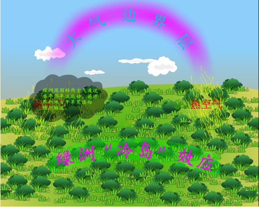 绿洲效应最显著的特征是“冷岛效应”,它是指绿洲在大气边界层形成的“冷岛”结构所产生的小气候效应。绿洲周围大尺度的热空气通过水平热平流和水平湍流运动会源源不断地自干旱荒漠向绿洲“冷岛”输送。在这种来自周围环境的热空气强迫下,白天会在绿洲上空200m左右形成一个较强的、稳定维持的大气逆温层和向下输送的感热通量层;即使在地表加热较强时,大气温度也仅在近地层靠近地表的薄层出现超绝热递减,维持不稳定层结和向上输送的感热通量。已经观测到,在大气逆温和向下感热通量较强时,大气逆温强度能达到0.8℃/100米,负感热通量的贡献可达净辐射的一半左右。由此,在时空剖面上,白天大气边界层下部大约200—300米高处大气往往临空会出现一个“映象热中心”。白天绿洲边界层下部大气的逆温结构。能够有效抑制绿洲近地层凉空气向高层大气扩散,从而反过来也使得绿洲大气的“冷岛”结构得以加强和维持。