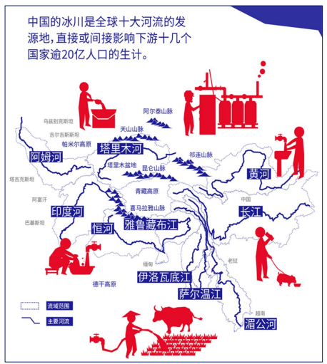 图 1 青藏高原的冰川是亚洲十大河流的发源地,直接或间接影响下游十几个国家近 20 亿人 口的生计。沈永平 提供